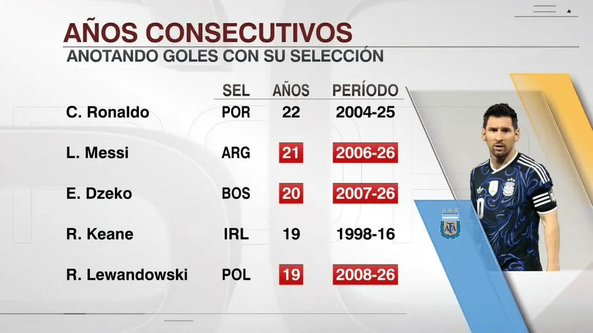虎扑04月01日讯 根据ESPN的统计,梅西已经连续21年代表国家队取得进球,阿根廷人在这项数据上超过了哲科(20),仅次于C罗(22)。